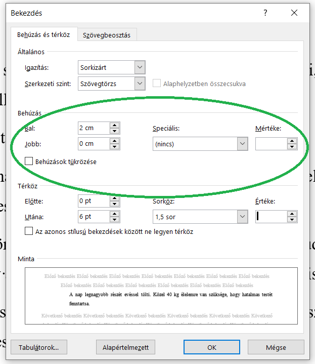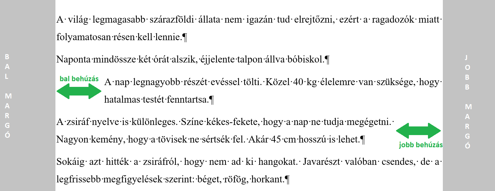 Bekezdésenként megadhatjuk, hogy a szövegünk milyen távol kezdődjön a margókhoz képest. Ezt behúzásnak nevezzük.