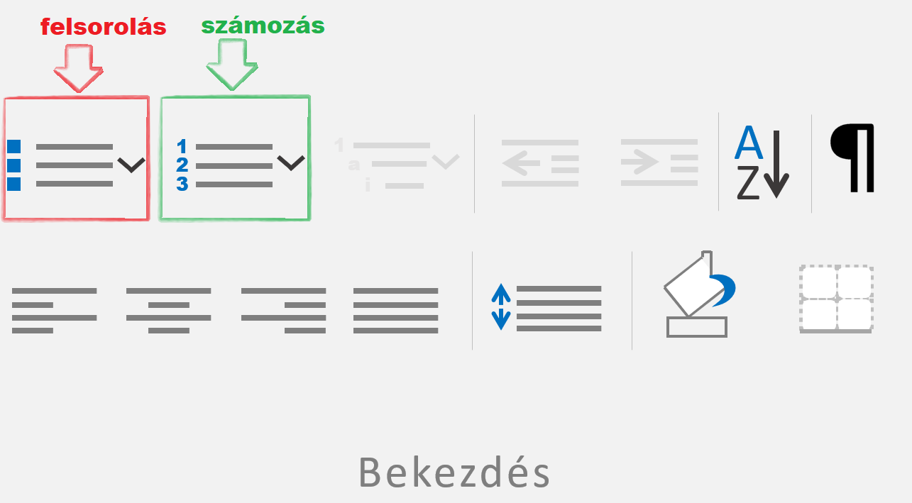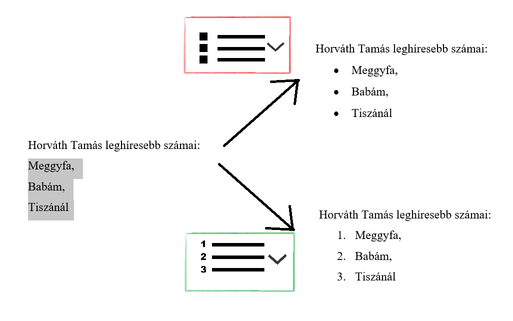 Ha a beírt listát kijelöljük, akkor a Bekezdés menüpont Felsorolás vagy Számozás ikonjai segítségével kiemelhetjük.
