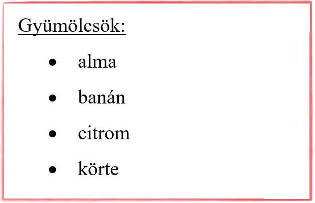 1. Begépeljük a listát. Minden elemet külön bekezdésbe írunk.