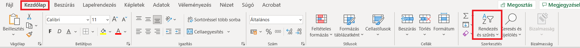 Megkeressük a Kezdőlap menüponton belül és a Rendezés és szűrés ikont.