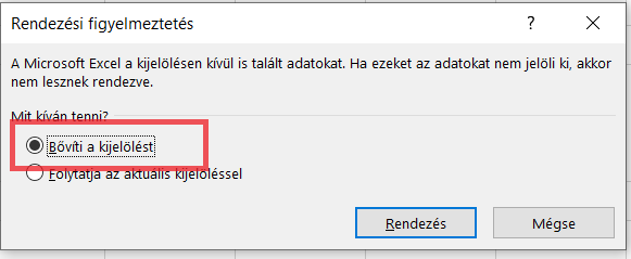 Végül a felugró ablakban kiválasztjuk, hogy a teljes táblázatra bővítjük a kijelésünket. Így nemcsak az első oszlop adatai rendeződnek át, hanem a hozzájuk tartozó összes egyéb cella is.